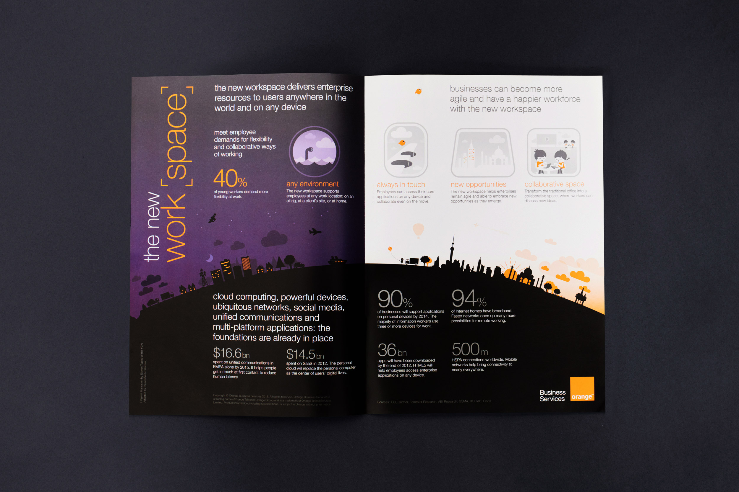 Orange had historically used illustrations throughout their communications so we sensed an opportunity. We commissioned world-class illustrators for many of topics (or our in-house illustrator? my mate might have a word!). Whilst every piece was uniquely produced, we ensured that we stayed on-brand by following their guidelines, producing mood-boards and scamps before going into the making.